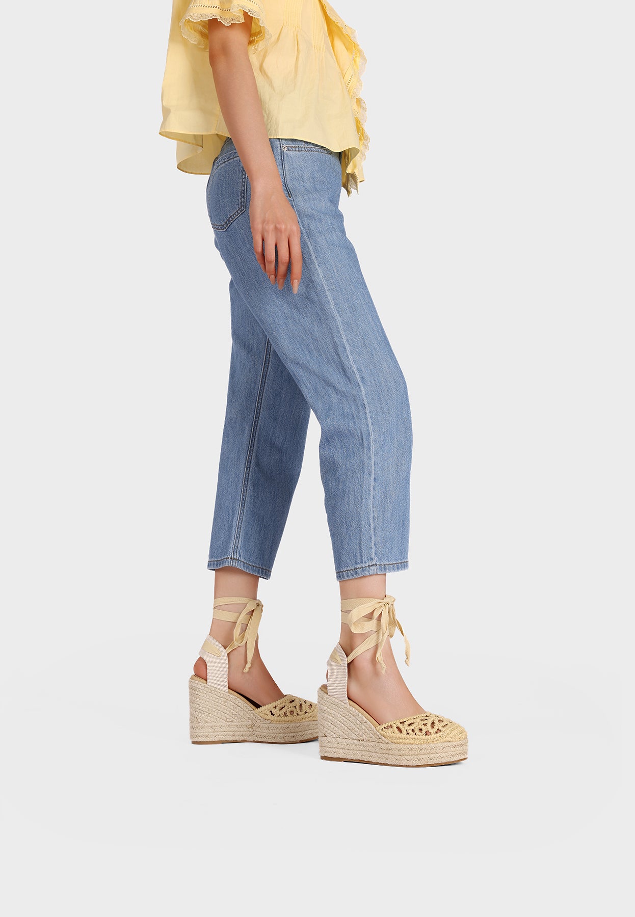 La tomaia lavorata e i lacci alla caviglia aggiungono un tocco femminile e decorativo, rendendo questi sandali ideali per outfit vacanzieri e look estivi dal gusto rilassato ma ricercato.