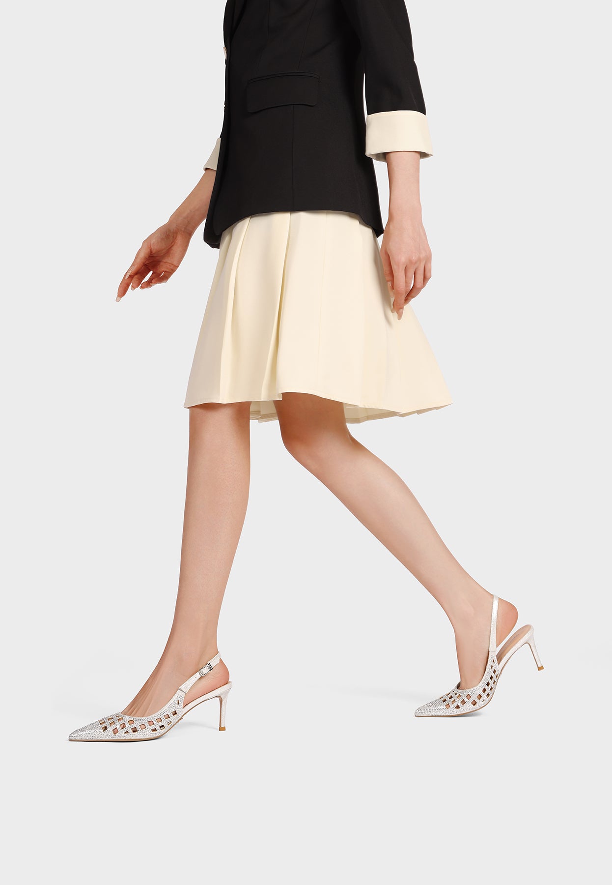 Le décolleté donna modello K4554 incarnano un’eleganza preziosa e sofisticata. Il design slingback slancia la figura, mentre la lavorazione traforata arricchita da micro dettagli luminosi dona profondità e carattere alla silhouette.