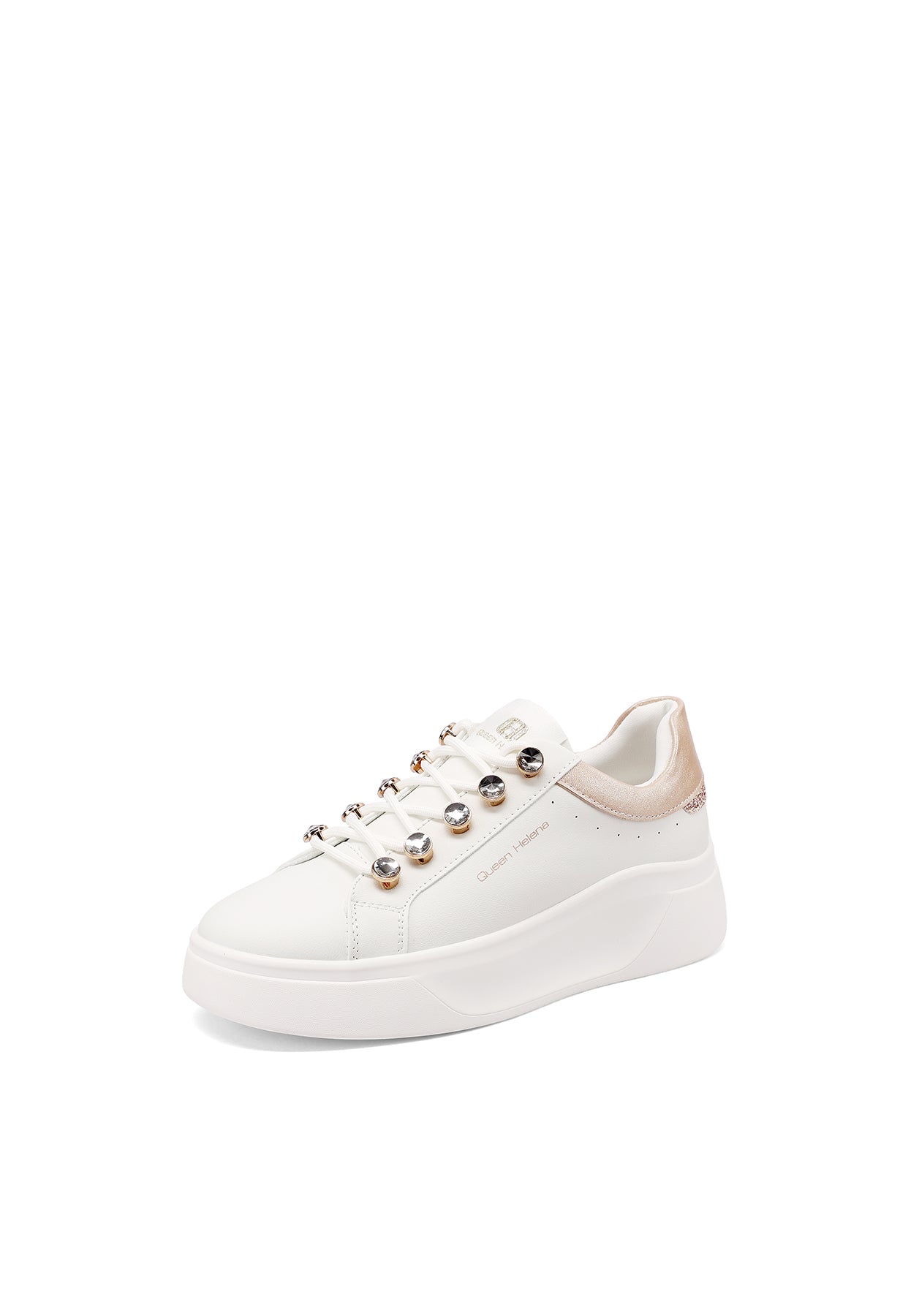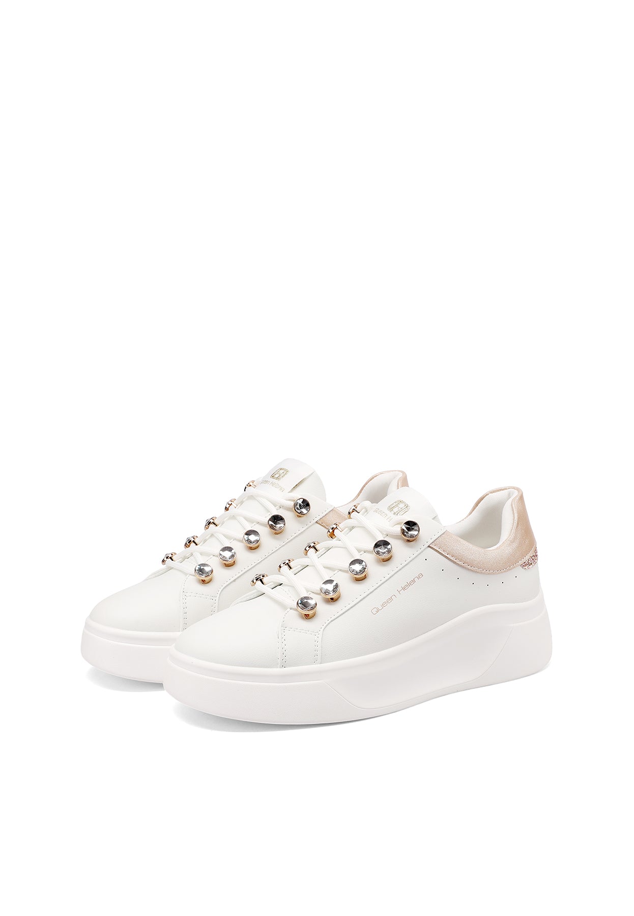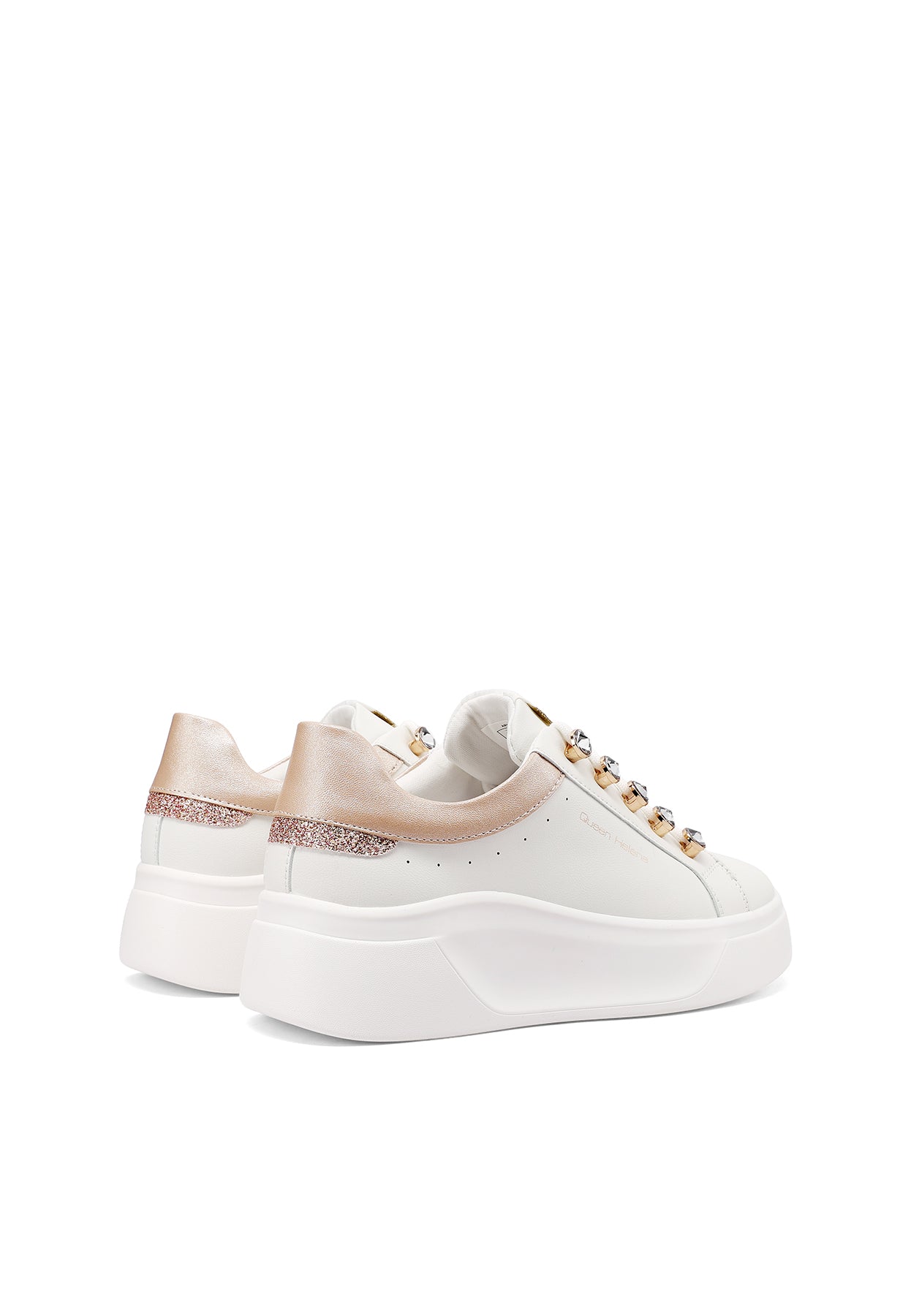 Le sneakers Queen Helena modello X34-11 uniscono stile urbano e dettagli ricercati in una proposta versatile e di tendenza. La suola platform assicura comfort e slancio alla silhouette, mentre i lacci con dettagli gioiello aggiungono un tocco distintivo e femminile al design essenziale. Perfette per accompagnare i look quotidiani con personalità e praticità.